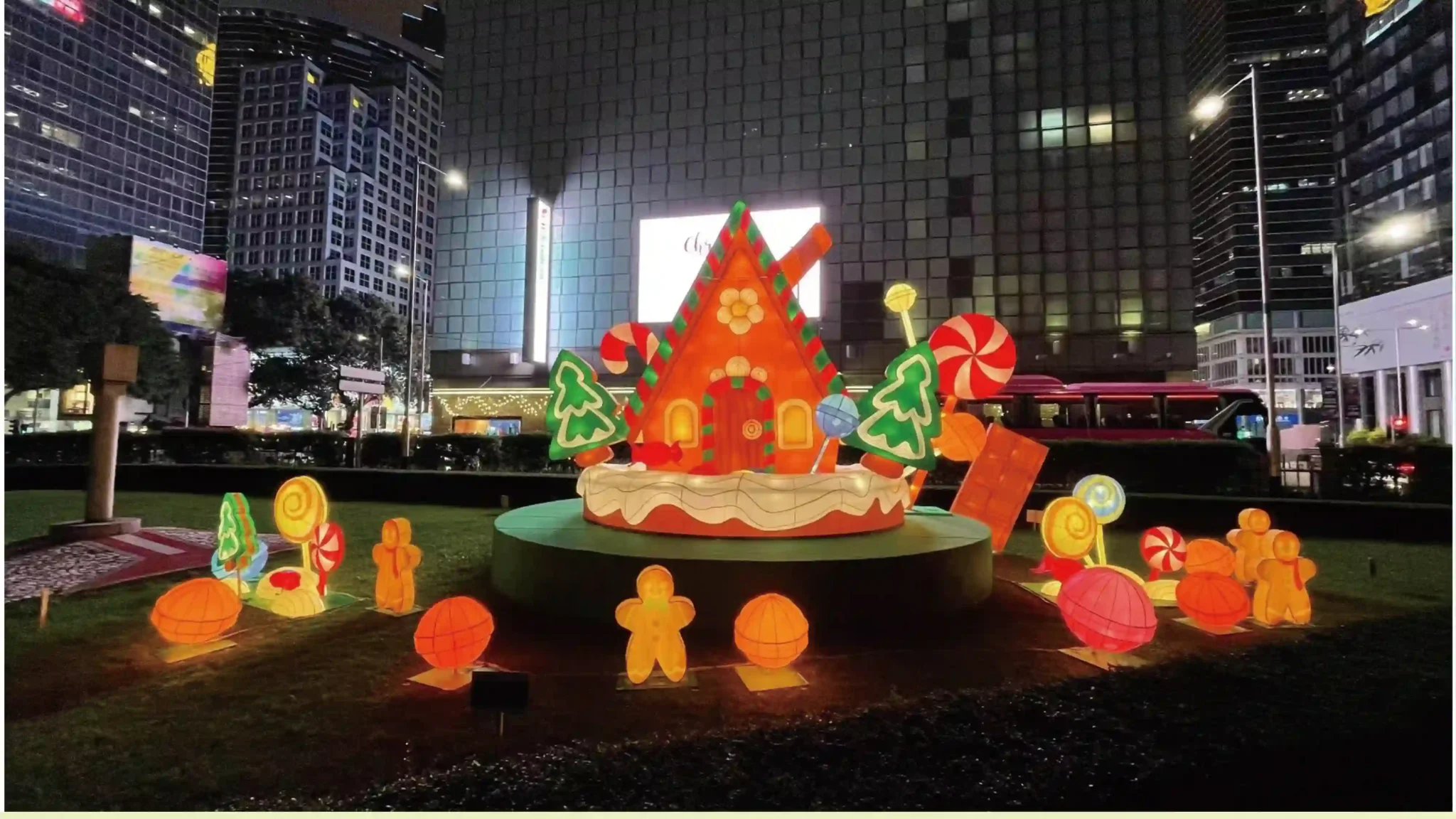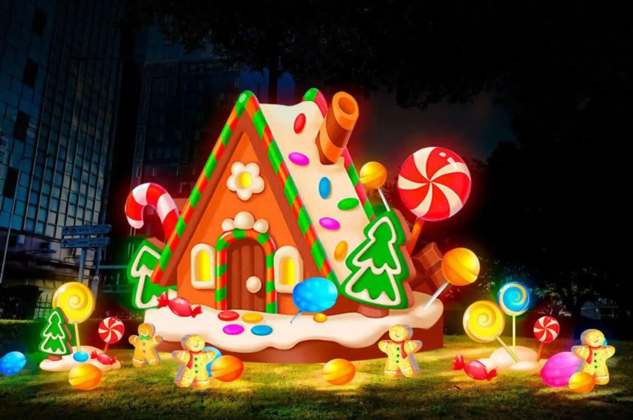 Warm lighting tones were used to match the gingerbread theme while ensuring the structure remains visually appealing in different viewing conditions. This approach helps the installation stand out at night without creating excessive brightness.