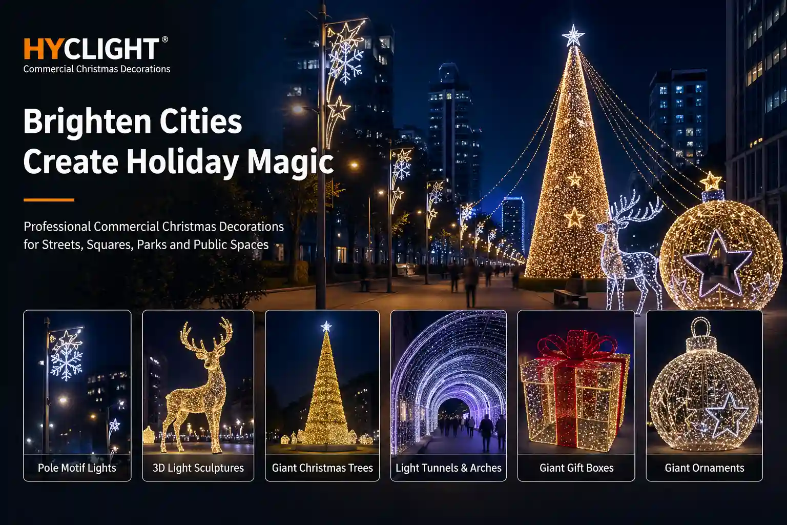 Les décorations de Noël des villes sont utilisées pour les rues, les places, les parcs, les bâtiments municipaux, les centres-villes et les lieux de manifestations publiques. Ces décorations doivent être visibles, sûres, résistantes aux intempéries et faciles à installer avant les fêtes de fin d'année.